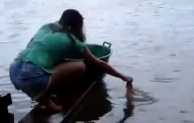 Παίρνουν ένα κομμάτι κρέας, το βουτάνε στο νερό, το δαγκώνουν τα πιράνχας και τα βγάζουν στην λεκάνη.
