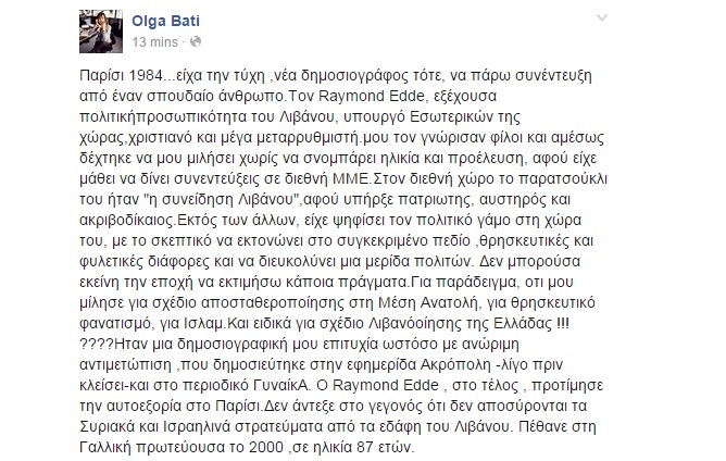 Αίσθηση προκάλεσε στον δημοσιογραφικό κόσμο η ανάρτηση στο Facebook της γνωστής δημοσιογράφου Όλγας Μπατή, η οποία θυμήθηκε ποιος ξένος πολιτικός την είχε προειδοποιήσει από το 1984 για «λιβανοποίηση» της Ελλάδας.Διαβάστε τι έγραψε η Όλγα Μπατή: Παρίσι 1984… είχα την τύχη, νέα δημοσιογράφος τότε, να πάρω συνέντευξη από έναν σπουδαίο άνθρωπο. Τον Raymond Edde, εξέχουσα πολιτική προσωπικότητα του Λιβάνου, υπουργό Εσωτερικών της χώρας, χριστιανό και μέγα μεταρρυθμιστή.